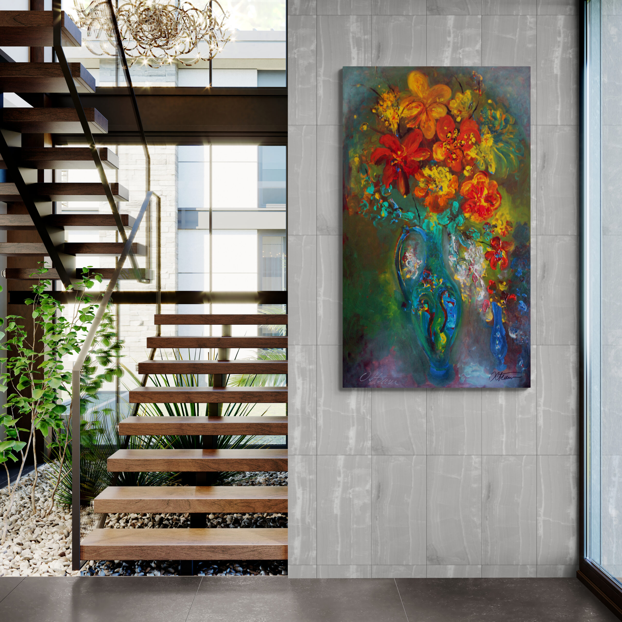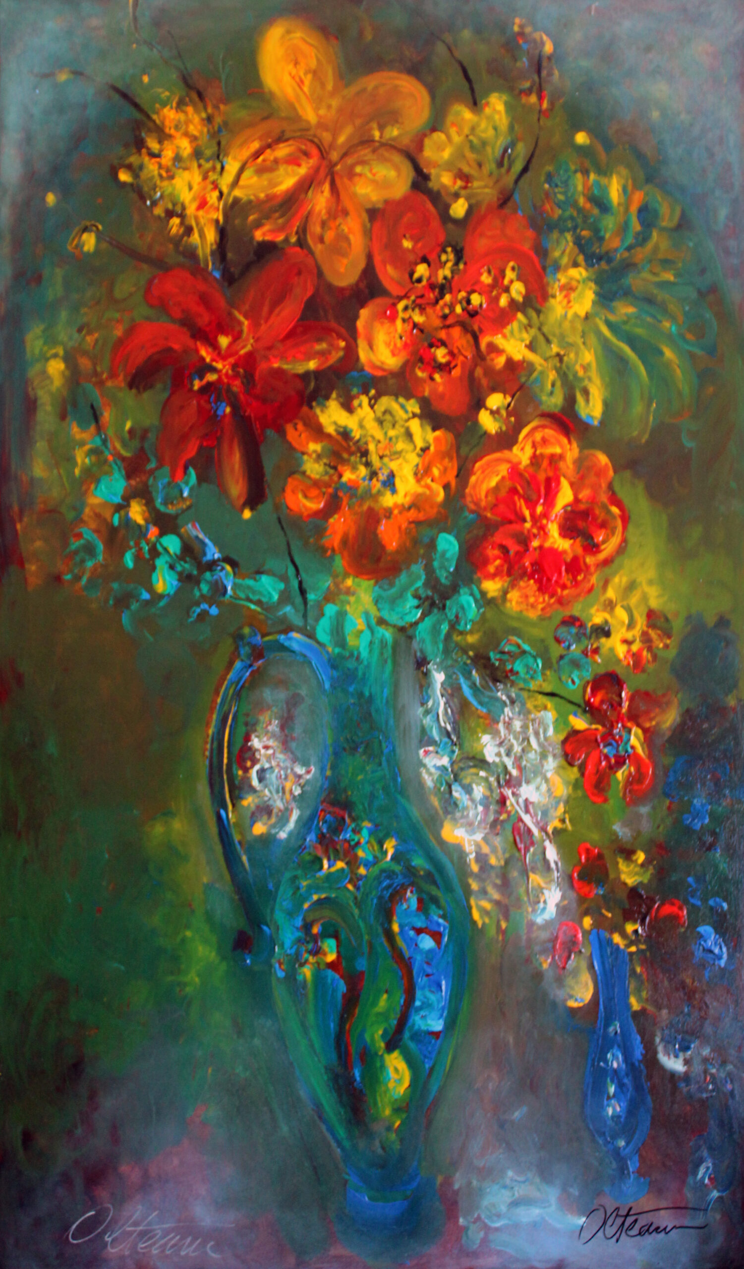 This monumental bouquet rises with the force of a vertical column, its flowers transformed into a vibrant architecture of color and light. The composition is dominated by fiery reds and glowing oranges, contrasted with the deep turquoise and emerald tones of the vase. Far from being a simple still life, the work conveys the idea of flowers as a living structure — a column of vitality, beauty, and renewal. The painter’s impasto technique gives the surface a tactile energy, turning color into movement and presence.