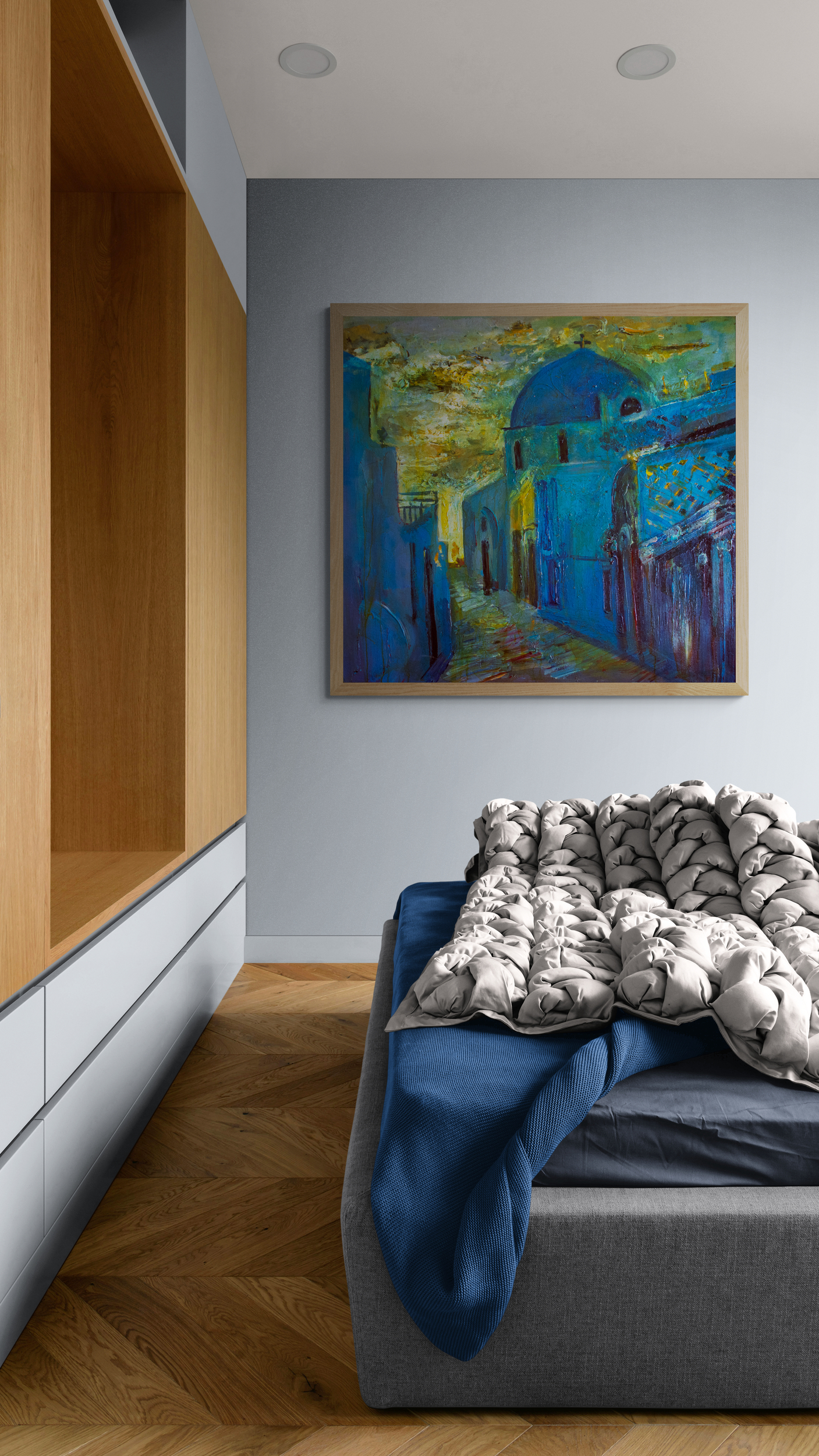 This painting immerses the viewer in the intimate atmosphere of a Mediterranean alley at dusk. The deep blue tones of the buildings and the luminous dome rising at the end of the path create a strong sense of mystery and transcendence. The golden light that seeps through the horizon suggests both hope and revelation, while the textured brushstrokes give the scene movement and vibrancy. It is less a representation of a street than a journey — a passage toward silence, elevation, and light.