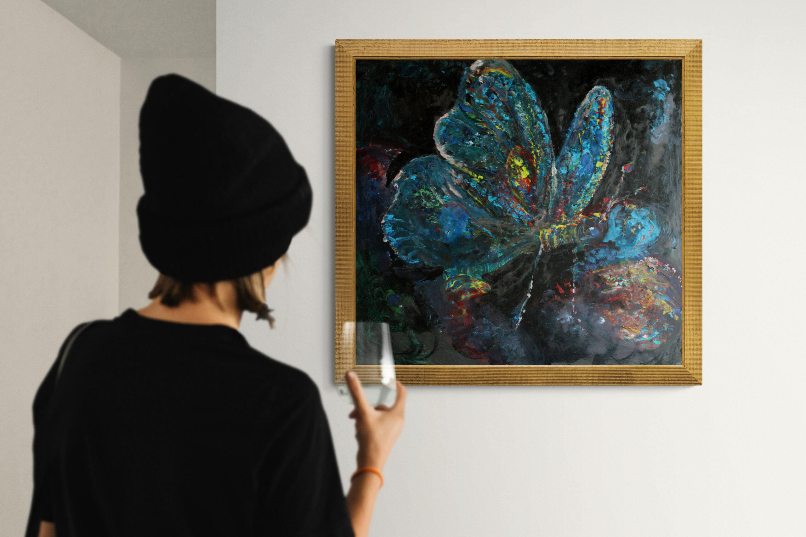 Pictorul construiește imaginea prin contraste puternice – albastrul profund al aripilor, reflexele de aur și foc – sugerând ideea unei lumini care nu se teme de noapte.
