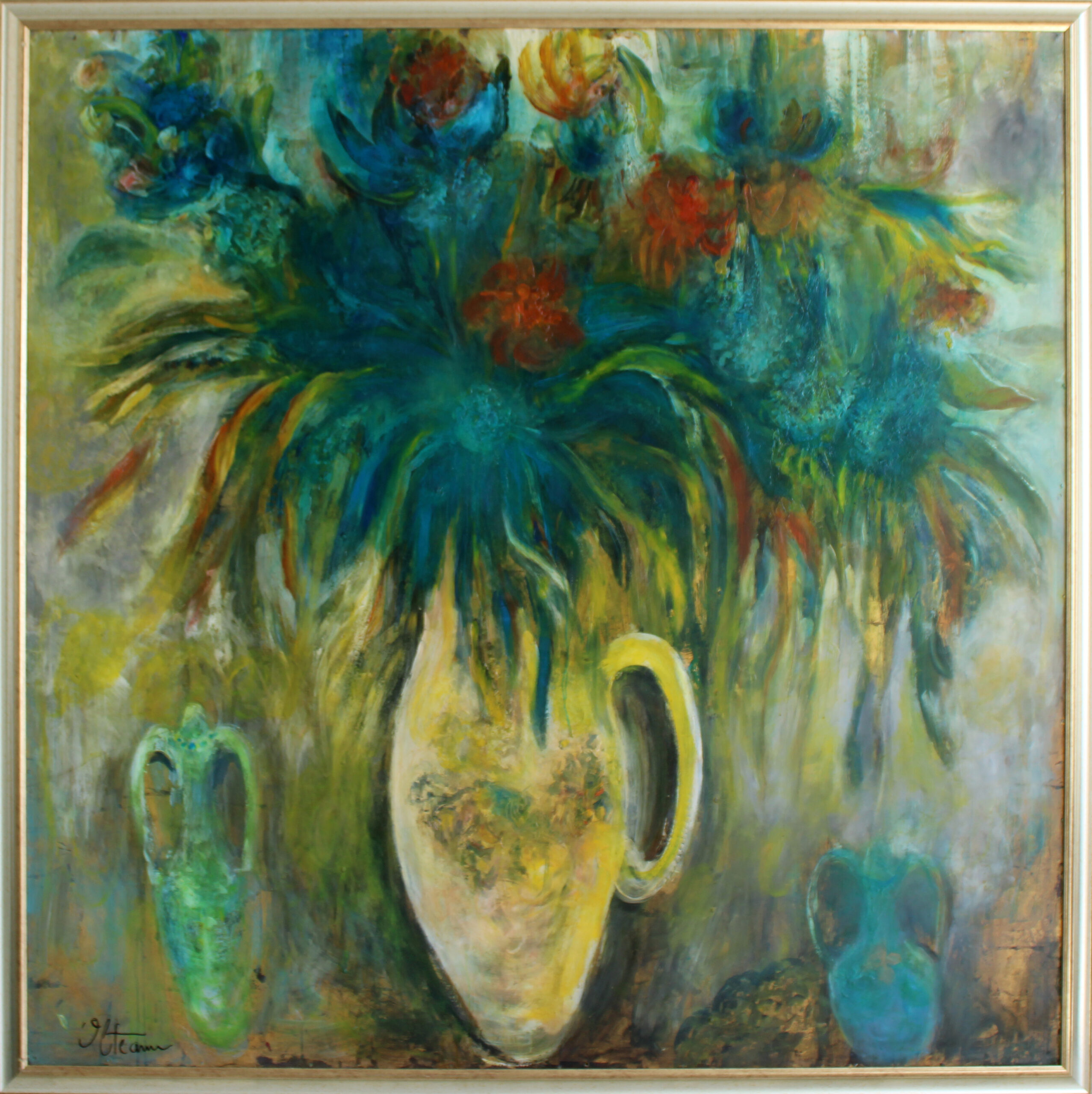 Pictorul Mihai Teodor Olteanu explorează aici echilibrul fragil dintre formă și disoluție, folosind o paletă dominată de verzi profunzi, turcoazuri și accente aurii, care transformă vasul central într-un simbol al creației.