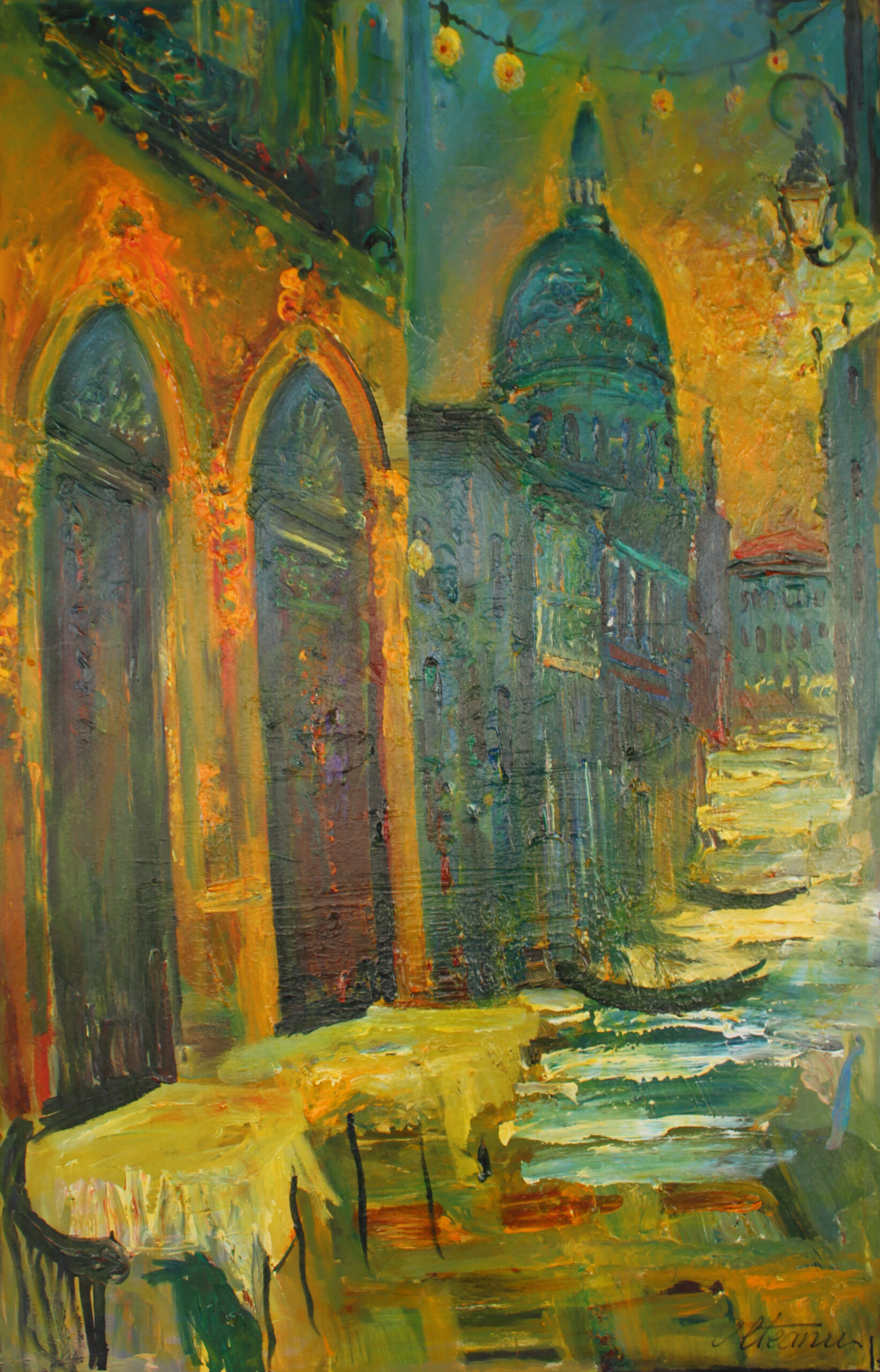 Cupola centrală domină compoziția ca un axis mundi al memoriei, iar reflexele de verde, galben și turcoaz creează un efect aproape muzical, de jazz vizual.