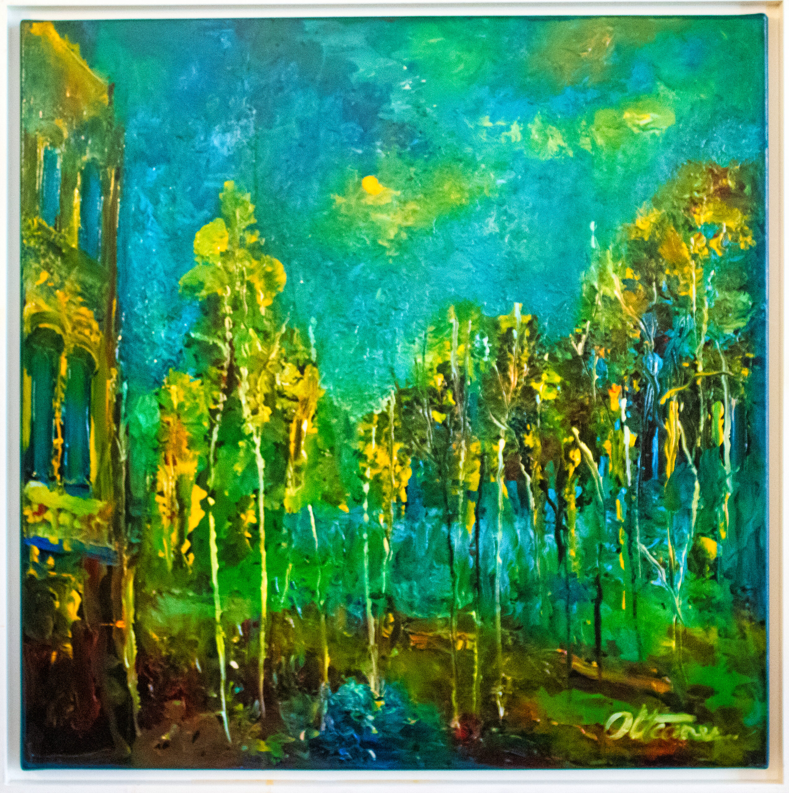 This painting captures the vibration of a forest where light and color become living forces. The slender trees rise like luminous threads against a sky of deep turquoise, their golden leaves glowing as if lit from within. On the left, a fragment of architecture opens the scene toward human presence, while the rest of the composition is consumed by the rhythm of nature. The work reveals a forest not as a static place, but as an organism — breathing, pulsating, and resonating with the energy of light.