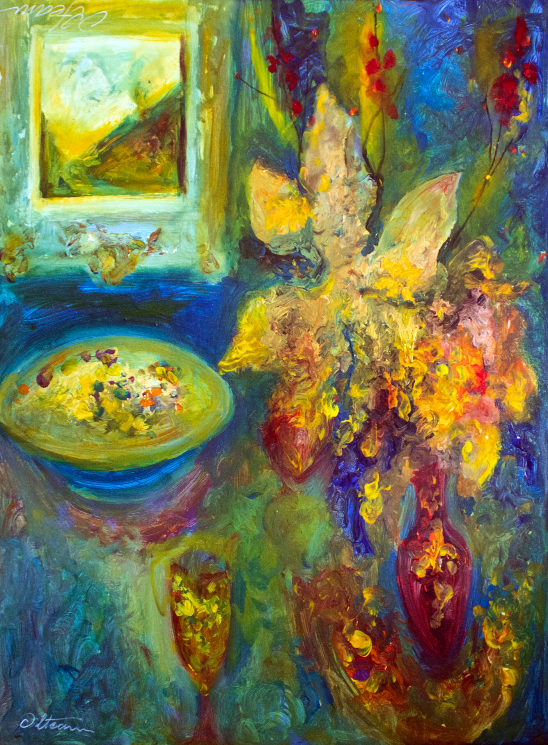 This painting embodies a feast of light and color, where objects dissolve into a vibrant interplay of forms. A bouquet of fiery yellows and reds fills the right side of the composition, counterbalanced by a glowing bowl and a chalice-like vessel below. On the wall, a framed landscape opens the space toward nature, creating a dialogue between interior and exterior, containment and expansion. The palette, dominated by golds, reds, greens, and blues, suggests both intimacy and celebration, turning the entire canvas into a luminous ritual of color.
