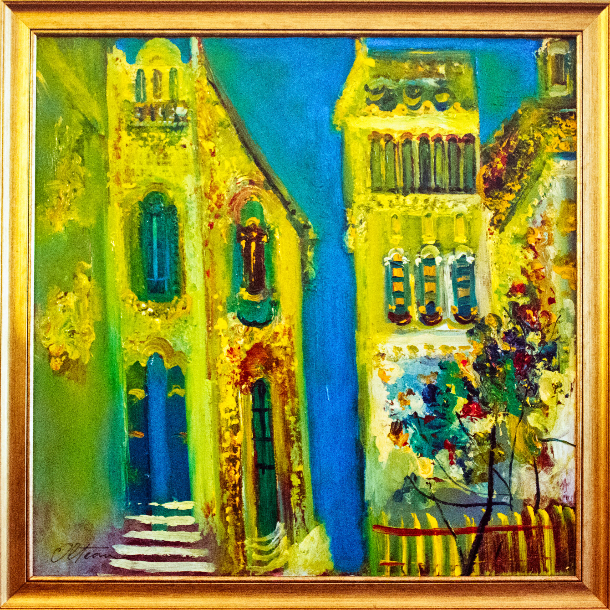This painting invites the viewer into a vibrant urban passage, where golden façades glow under a turquoise sky. The tall, elongated buildings frame the narrow space between them, suggesting both intimacy and grandeur. The brushwork is energetic, and the palette — dominated by yellows, greens, and blues — transforms the scene into an almost dreamlike vision. The work captures not only architecture, but also the rhythm of the city, the silent dialogue between stone, light, and time.
