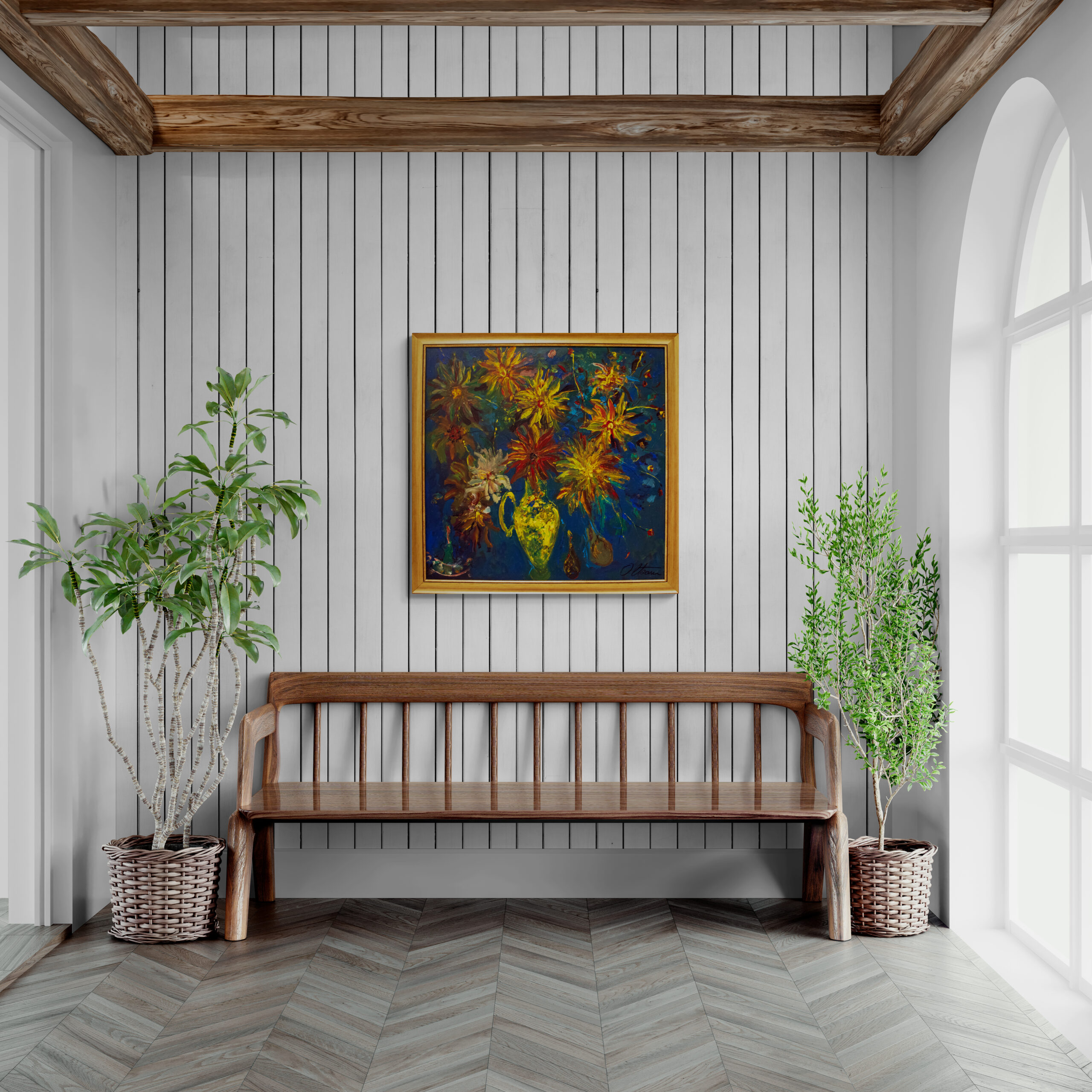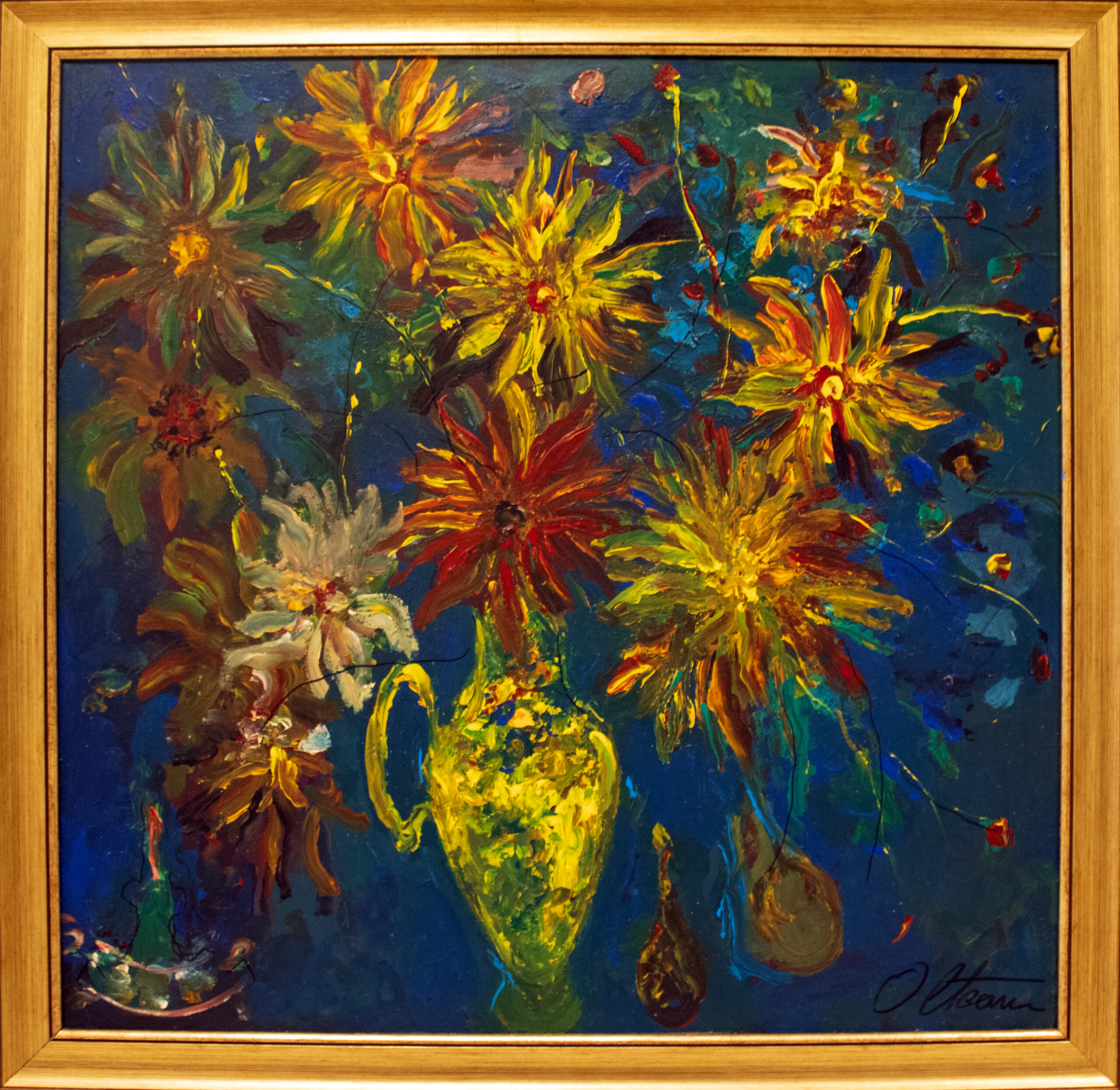 The painting radiates an incandescent energy, where flowers blaze like living flames against the deep, nocturnal blue of the background. At the center, a luminous yellow vase becomes both anchor and beacon, holding together a bouquet that seems to defy gravity with its fiery burst. The reds, golds, and ochres extend outward like tongues of flame, each petal vibrating with intensity. This work is not only a floral arrangement, but a vision of life burning with beauty, light, and transience.