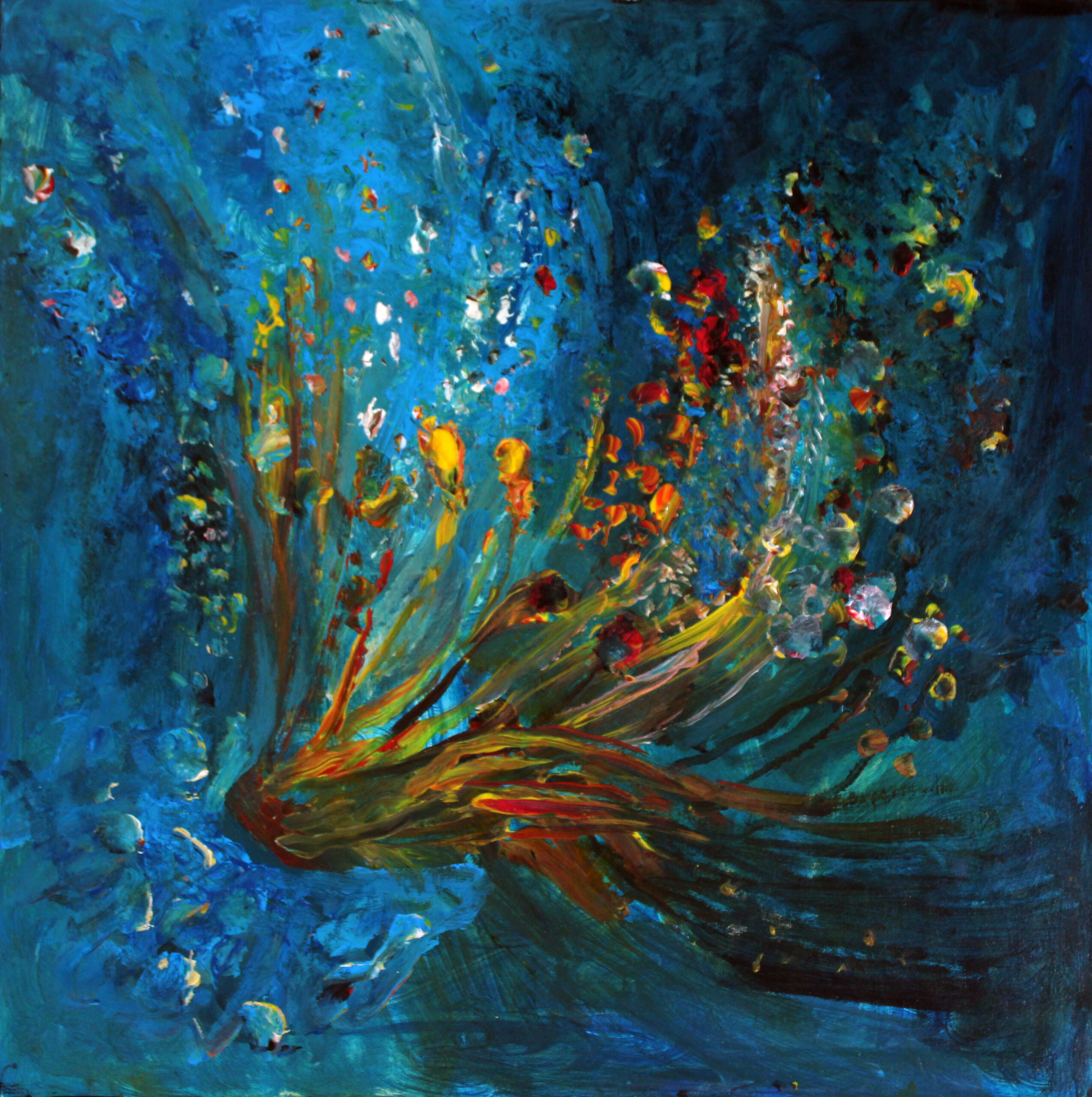 Compoziția dominată de nuanțe de albastru intens, turcoaz și accente de roșu incandescent evocă o lume acvatică în care elementele par să plutească între vis și energie pură.